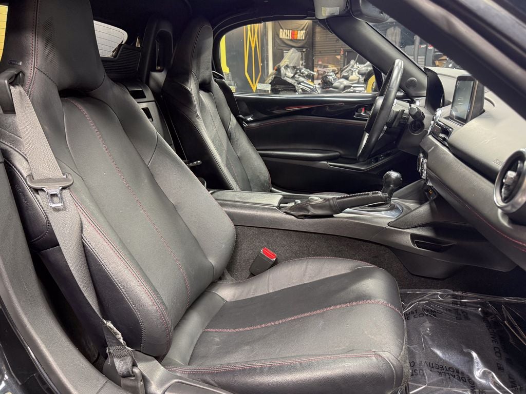 Black W/Red Stitching Leather, 4-Wheel Disc Brakes, 9 Speakers, ABS brakes, Advanced Keyless Entry System, Air Conditioning, Alloy wheels, AM/FM radio: SiriusXM, Auto High-beam Headlights, Auto-dimming door mirrors, Auto-dimming Rear-View mirror, Automatic temperature control, Brake assist, Bumpers: body-color, CD player, Convertible roof lining, Convertible roof wind blocker, Delay-off headlights, Driver vanity mirror, Dual front impact airbags, Dual front side impact airbags, Electronic Stability Control, Emergency communication system: Mazda Connect, Four wheel independent suspension, Front anti-roll bar, Front Bucket Seats, Front Center Armrest, Fully automatic headlights, Garage door transmitter: HomeLink, Glass rear window, Heated door mirrors, Heated front seats, Illuminated entry, Leather Shift Knob, Leather Upholstery, Low tire pressure warning, Navigation System, Occupant sensing airbag, Outside temperature display, Panic alarm, Passenger vanity mirror, Power door mirrors, Power steering, Power windows, Radio data system, Radio: AM/FM/HD w/Navigation & CD Player, Rain sensing wipers, Rear anti-roll bar, Rear window defroster, Reclining Front Heated Bucket Seats, Remote keyless entry, Security system, Speed control, Speed-sensing steering, Sport steering wheel, Steering wheel mounted audio controls, Tachometer, Tilt steering wheel, Traction control, Trip computer, Variably intermittent wipers, and Wheels: 17 x 7 Dark Silver Aluminum Alloy.