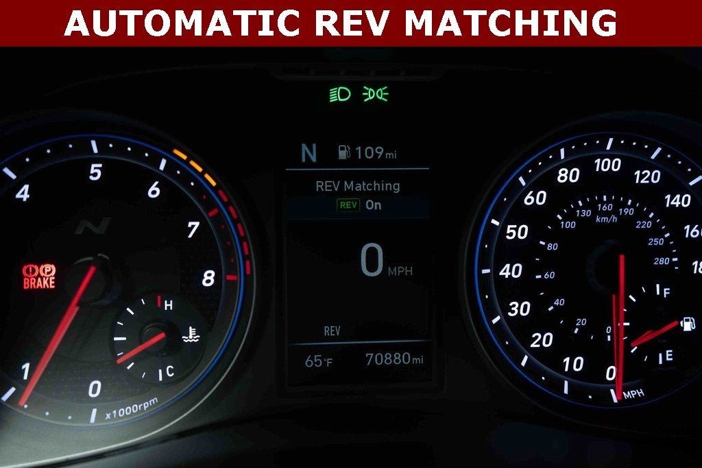 Option Group 01, 18 x 7.5J Alloy Wheels, 4-Wheel Disc Brakes, 8 Speakers, ABS brakes, Air Conditioning, Alloy wheels, AM/FM radio: SiriusXM, Apple CarPlay & Android Auto, Automatic temperature control, Brake assist, Bumpers: body-color, Delay-off headlights, Driver door bin, Driver vanity mirror, Dual front impact airbags, Dual front side impact airbags, Electronic Stability Control, Emergency communication system: Blue Link, Exterior Parking Camera Rear, Four wheel independent suspension, Front anti-roll bar, Front Bucket Seats, Front Center Armrest, Front reading lights, Front Sport Seats, Fully automatic headlights, Heated door mirrors, Illuminated entry, Leather Shift Knob, Leather steering wheel, Low tire pressure warning, Occupant sensing airbag, Outside temperature display, Overhead airbag, Overhead console, Panic alarm, Passenger door bin, Passenger vanity mirror, Power door mirrors, Power steering, Power windows, Premium audio system: Infinity, Premium Cloth Seat Trim w/Performance Blue Stitch, Radio: AM/FM 8 Display Audio, Rear anti-roll bar, Rear window defroster, Rear window wiper, Remote keyless entry, Security system, Speed control, Speed-sensing steering, Split folding rear seat, Spoiler, Steering wheel mounted audio controls, Tachometer, Telescoping steering wheel, Tilt steering wheel, Traction control, Trip computer, Turn signal indicator mirrors, and Variably intermittent wipers.