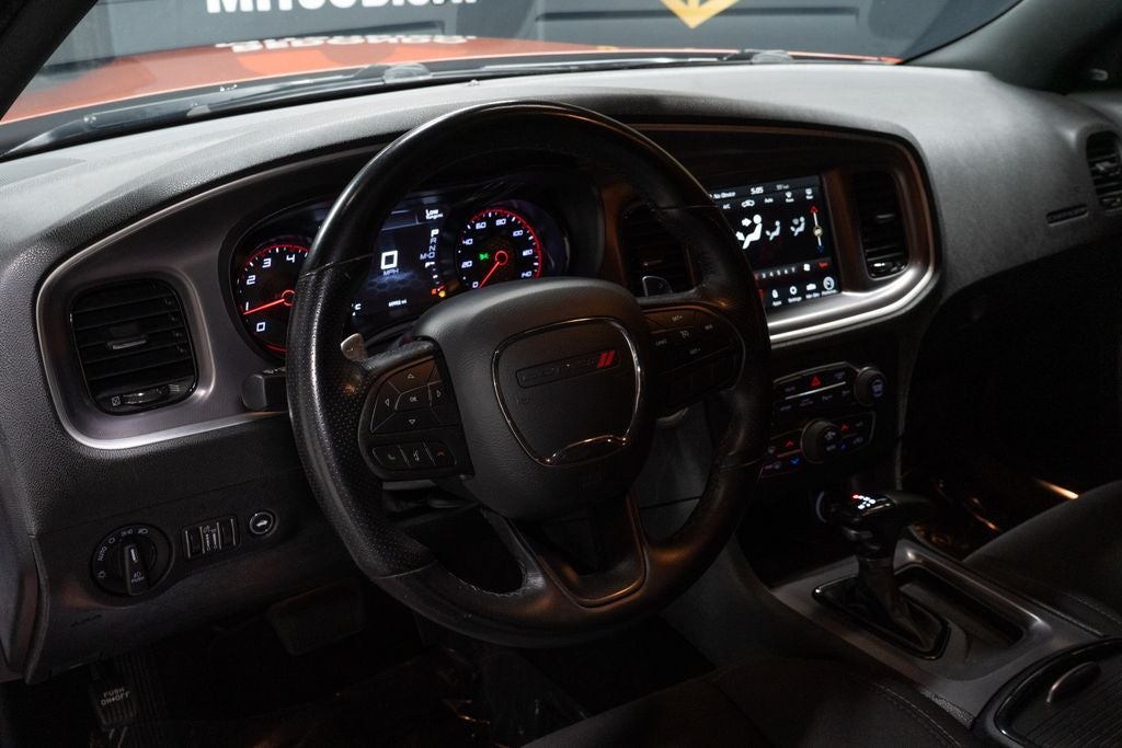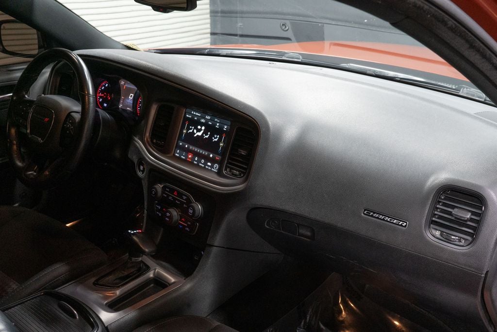 Blacktop Package (Black 1-Piece Performance Spoiler, Black Badge, Black Dodge Grille Badge, Gloss Black I/P Cluster Trim Rings, Rhombi 2-Pc Wheel Center Cap, Satin Black Charger Decklid Badge, Satin Black Dodge Tail Lamp Badge, and Wheels: 20 x 8 Black Noise Painted), Quick Order Package 2EH, Black Cloth, 4-Wheel Disc Brakes, 6 Speakers, ABS brakes, Air Conditioning, Alloy wheels, AM/FM radio: SiriusXM, Anti-whiplash front head restraints, Apple CarPlay, Apple CarPlay/Android Auto, Auto-dimming Rear-View mirror, Automatic temperature control, Body Color Exterior Mirrors, Brake assist, Bumpers: body-color, Cloth Performance Seats, Compass, Delay-off headlights, Driver door bin, Driver vanity mirror, Dual front impact airbags, Dual front side impact airbags, Electronic Stability Control, Emergency communication system: SiriusXM Guardian, Four wheel independent suspension, Front anti-roll bar, Front Bucket Seats, Front Center Armrest, Front dual zone A/C, Front fog lights, Front License Plate Bracket, Front reading lights, Fully automatic headlights, Garage door transmitter: HomeLink, Google Android Auto, GPS Antenna Input, Heated door mirrors, Illuminated entry, Integrated Center Stack Radio, Integrated Voice Command w/Bluetooth®, Knee airbag, Leather Shift Knob, Low tire pressure warning, Media Hub (2 USB, AUX), Occupant sensing airbag, Outside temperature display, Overhead airbag, Overhead console, Panic alarm, ParkView Rear Back-Up Camera, Passenger door bin, Passenger vanity mirror, Power 2-Way Driver Lumbar Adjust, Power door mirrors, Power driver seat, Power steering, Power windows, Radio: Uconnect 4C w/8.4 Display, Rear anti-roll bar, Rear reading lights, Rear seat center armrest, Rear window defroster, Remote keyless entry, Speed control, Speed-Sensitive Wipers, Split folding rear seat, Spoiler, Sport steering wheel, Steering wheel mounted audio controls, Tachometer, Telescoping steering wheel, Tilt steering wheel, Traction control, Trip computer, USB Host Flip, Variably intermittent wipers, and Wheels: 20 x 8 Satin Carbon Painted.