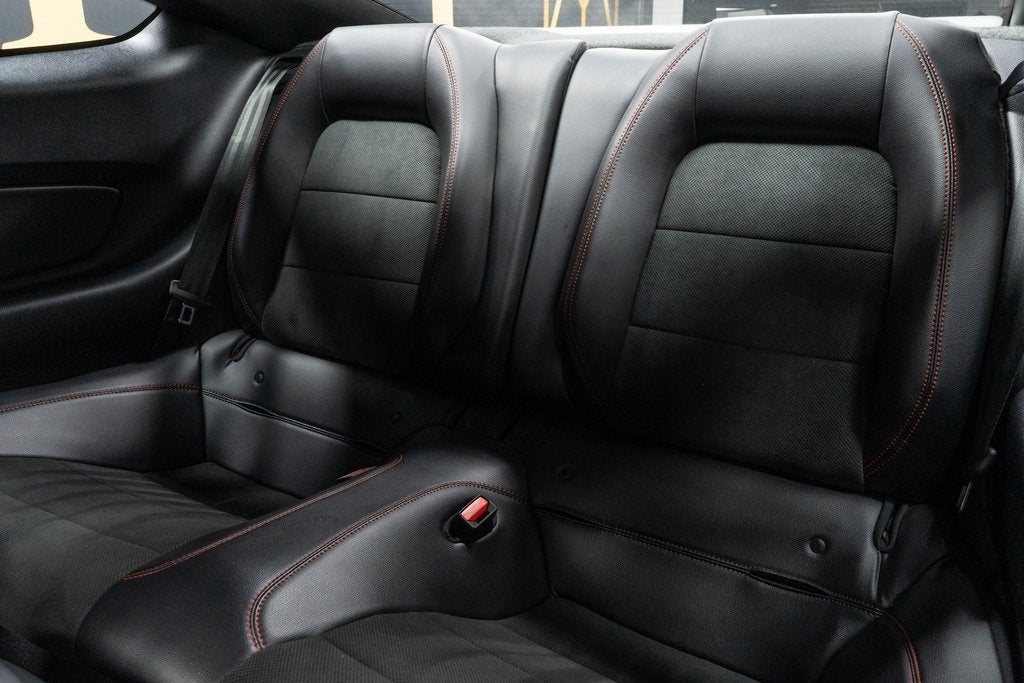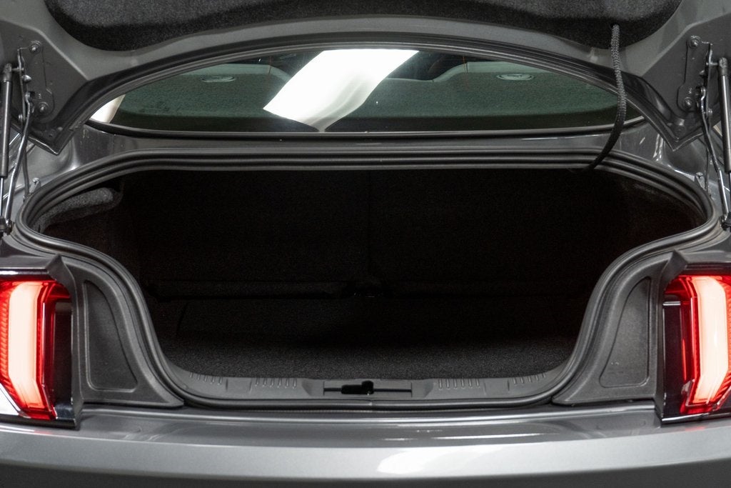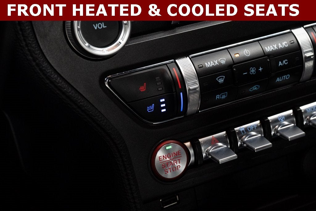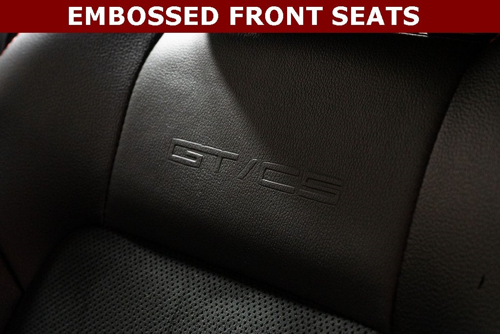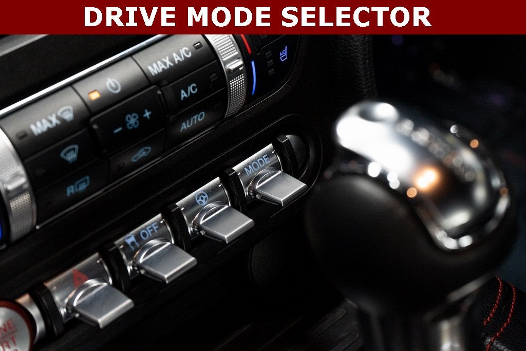 California Special Package (Floor Mats w/Red Contrast Stitching and Wheels: 19 x 8.5 Machined-Face Aluminum), Equipment Group 401A (Leather-Trimmed Bucket Seats w/Color Accents), Ford Safe & Smart Package, 4-Wheel Disc Brakes, ABS brakes, Active Cruise Control, Air Conditioning, Alloy wheels, AM/FM Stereo, Auto High-beam Headlights, Auto-dimming Rear-View mirror, Black GT, 5.0 & Pony Badges, Black/Red Mid Body Side Stripe, Brake assist, Bumpers: body-color, Compass, Delay-off headlights, Driver door bin, Driver vanity mirror, Dual front impact airbags, Dual front side impact airbags, Electronic Stability Control, Emergency communication system: 911 Assist, Exterior Parking Camera Rear, Four wheel independent suspension, Front anti-roll bar, Front Bucket Seats, Front Center Armrest, Front fog lights, Front reading lights, Fully automatic headlights, Illuminated entry, Knee airbag, Leather Shift Knob, Low tire pressure warning, Occupant sensing airbag, Outside temperature display, Overhead airbag, Overhead console, Panic alarm, Passenger door bin, Passenger vanity mirror, Power door mirrors, Power driver seat, Power passenger seat, Power steering, Power windows, Radio data system, Rain sensing wipers, Rear anti-roll bar, Rear Parking Sensors, Rear window defroster, Remote keyless entry, Security system, Speed control, Speed-sensing steering, Speed-Sensitive Wipers, Split folding rear seat, Spoiler, Steering wheel mounted audio controls, Tachometer, Telescoping steering wheel, Tilt steering wheel, Traction control, Trip computer, Variably intermittent wipers, Voltmeter, and Wheels: 18 x 8 Machined-Face Aluminum.