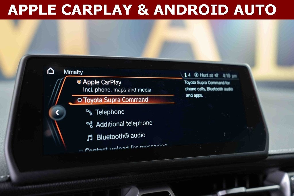 ABS brakes, Alloy wheels, Electronic Stability Control, Front dual zone A/C, Heated door mirrors, Heated front seats, Heated Front Sport Seats, Illuminated entry, Leather Seat Trim, Low tire pressure warning, Navigation System, Remote keyless entry, Traction control, 12 Speakers, 4-Wheel Disc Brakes, Adaptive suspension, Air Conditioning, AM/FM radio: SiriusXM, Apple CarPlay, Auto High-beam Headlights, Auto-dimming door mirrors, Auto-dimming Rear-View mirror, Automatic temperature control, Brake assist, Bumpers: body-color, Child-Seat-Sensing Airbag, Delay-off headlights, Driver door bin, Driver vanity mirror, Dual front impact airbags, Dual front side impact airbags, Emergency communication system: Supra Connect (4-year trial), Exterior Parking Camera Rear, Four wheel independent suspension, Front anti-roll bar, Front Bucket Seats, Front Center Armrest, Front reading lights, Fully automatic headlights, Garage door transmitter: HomeLink, Heads-Up Display, Knee airbag, Leather Shift Knob, Leather steering wheel, Memory seat, Occupant sensing airbag, Outside temperature display, Overhead airbag, Panic alarm, Passenger door bin, Passenger vanity mirror, Power door mirrors, Power driver seat, Power passenger seat, Power steering, Power windows, Radio data system, Radio: Supra Command w/500W JBL HiFi Surround Sound, Rain sensing wipers, Rear anti-roll bar, Rear window defroster, Security system, Speed control, Speed-sensing steering, Speed-Sensitive Wipers, Steering wheel mounted audio controls, Tachometer, Telescoping steering wheel, Tilt steering wheel, Trip computer, Turn signal indicator mirrors, Variably intermittent wipers, and Wheels: 19 Frozen Gunmetal Gray Forged-Aluminum.